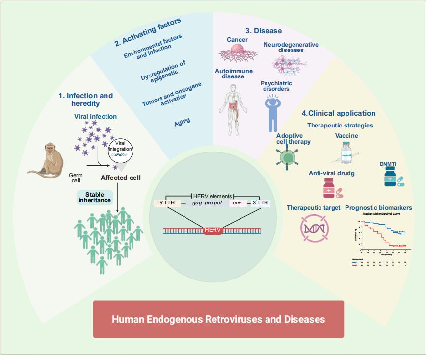 近日,我院党委书记马虎教授团队在期刊《MedComm》(IF=10.7,中科院和JCR双一区,TOP期刊)上发表了一篇题为“Human Endogenous Retroviruses and Diseases”的综述论文。我院党委书记马虎教授,胸部肿瘤科周建国副主任医师为该论文共同通讯作者,我院第二临床学院肿瘤学硕士研究生陈灿为该论文第一作者。