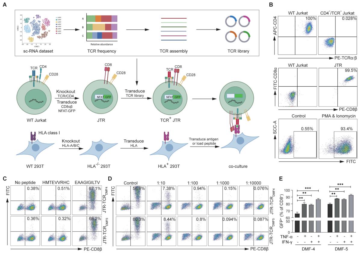 通过搭建由NFAT-GFP报告细胞、新抗原呈递系统、高效率TCR组装组成的实验平台;利用HPV16阳性的宫颈癌患者样本公共单细胞测序数据库,根据肿瘤反应性T细胞基因表达特征挑选潜在的肿瘤反应性TCR,筛选靶向HPV16的肿瘤特异性TCR并鉴定其抗原表位。为宫颈癌免疫治疗提供新靶点,也为新抗原特异性TCR鉴定提供新思路。