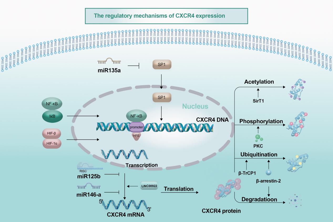 该文系统总结了趋化因子受体CXCR4在肺癌中的分子特征、调控网络及转化应用前景,展望了其在精准治疗与生物标志物指导下干预策略的未来方向。CXCR4异常表达常见于肺癌,与不良预后、转移及治疗耐药相关,其信号轴可调控肿瘤细胞增殖、侵袭等关键过程。